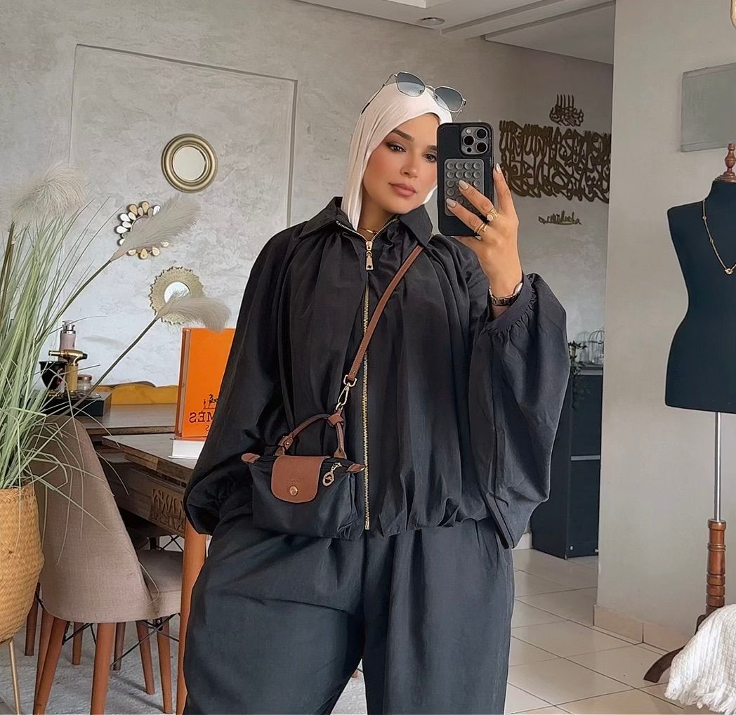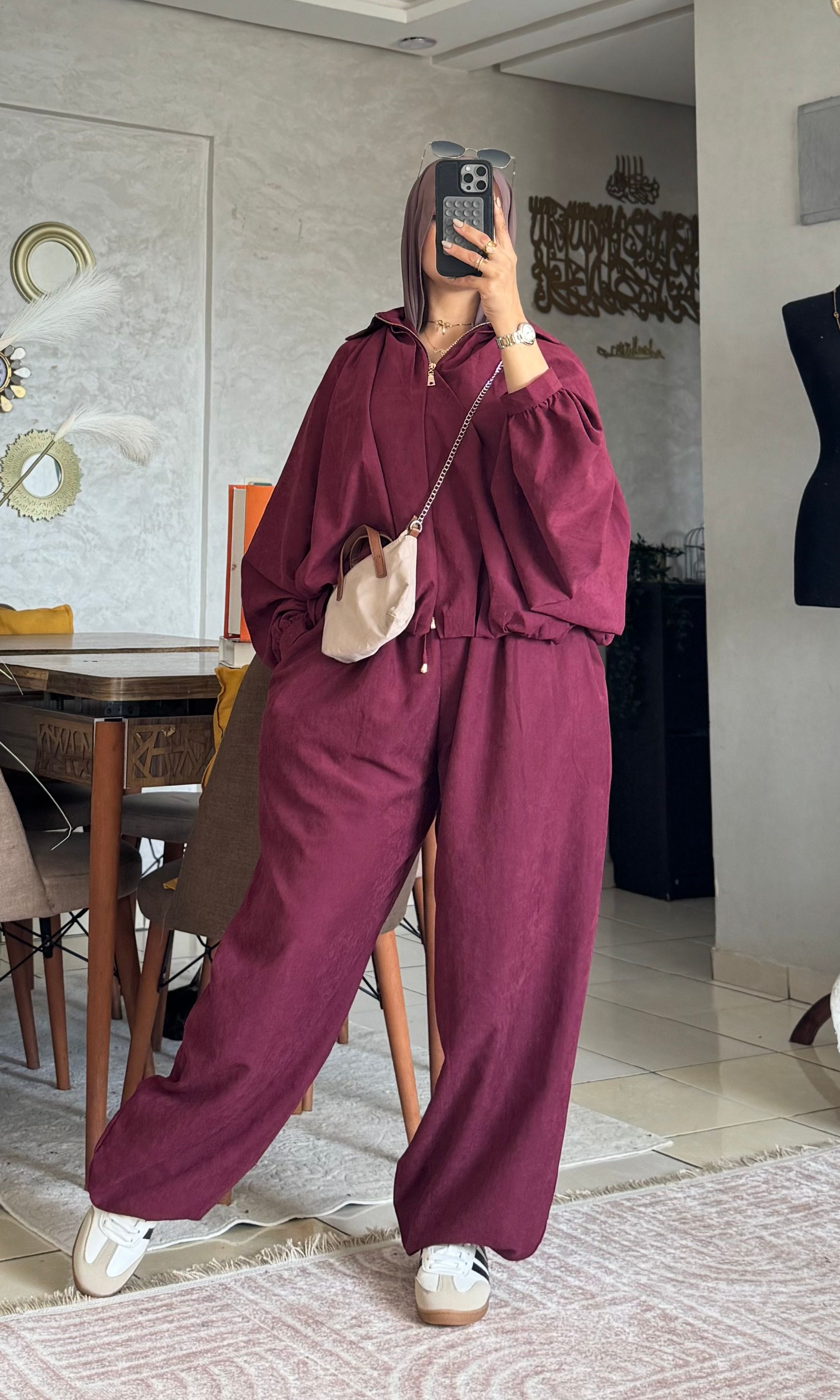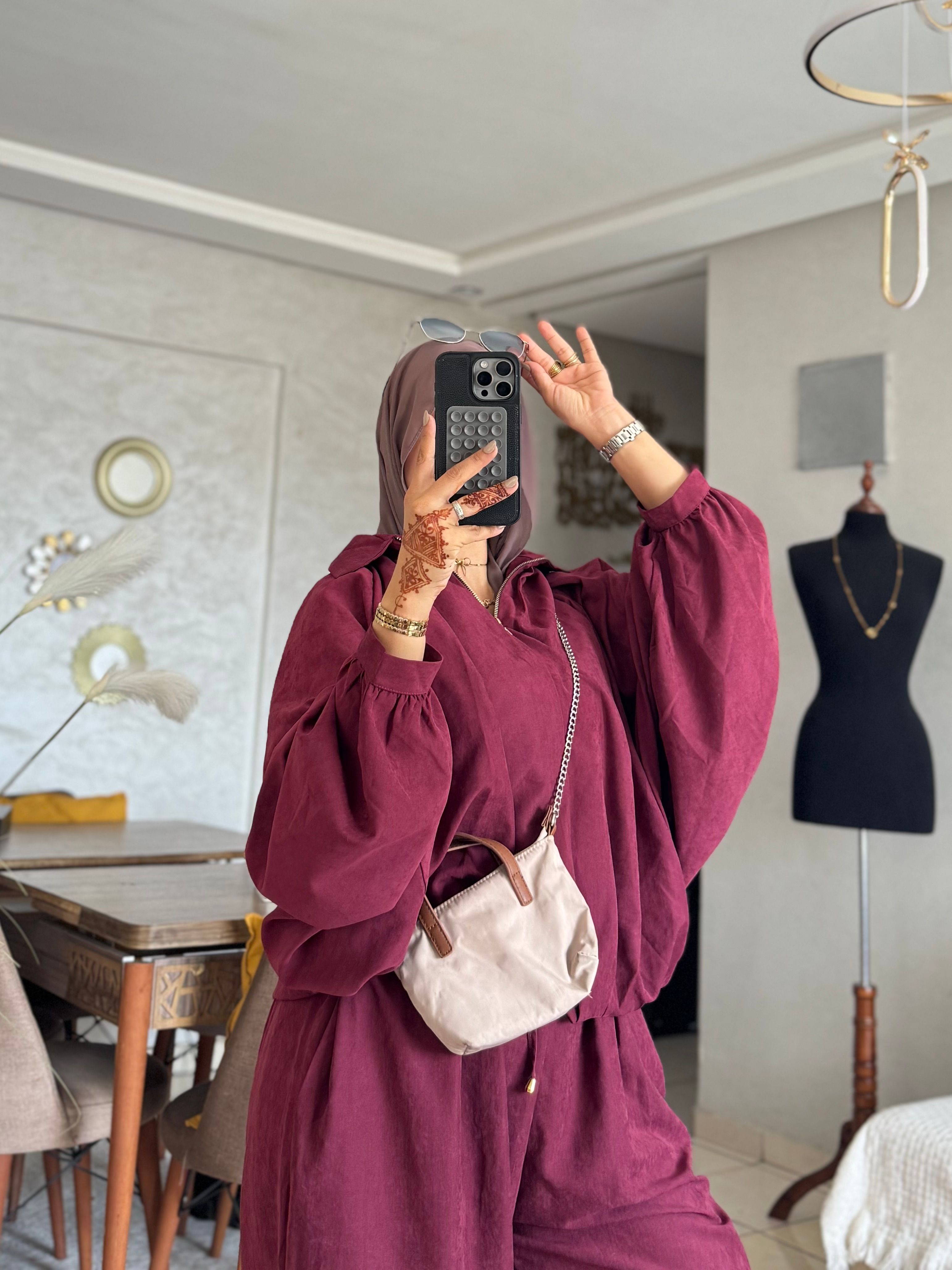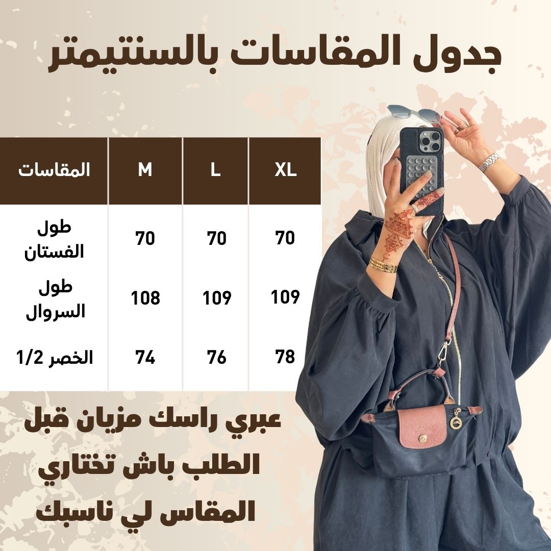 جاي من ثوب فودان مستورد من تركيا، وخادمينه بطريقة عصرية باش يعطيك راحة فالحركة وكلاس فاللبسة.الطقم.